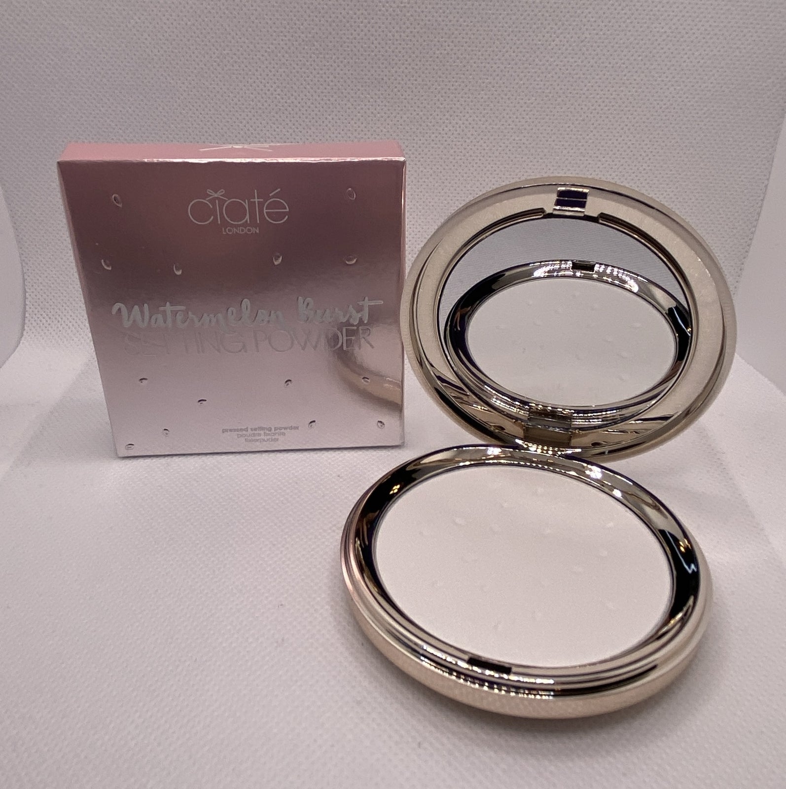 Ciaté London Watermelon Burst Pressed Setting Powder — polvo compacto translúcido de 8 g (0.17 oz) con aroma ligero a sandía y un sutil efecto glow. Contiene extracto de sandía, ácido hialurónico y vitamina E, lo que permite fijar maquillaje sin resecar y lograr un acabado suave y radiante